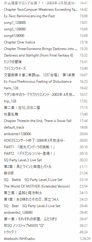 ぱぱらぽっぱ2017 2月 もう今年の12分の1が終わったんだって。マジかよヘイストでもかかってんのか。 増加分【2017/02/01】今日は、スパゲッティを、食べました。てきとうに、作ったたらこクリームが、すごく、おいしかったので、また作ろうと思いました。小学生が書くような文章ってどうやれば書けるんでskyそういえばアルフレッドが持ち歩いているスパゲッティはディチェコだということをいまさら知る。期待に応えるすごいやつだよ。いまさらといえばとてつもなくいまさらなんですが、哀しみの王ってヒューポーなんじゃねっていう考えにいたって、考えれば考えるほどそうとしか思えなくなっています。Now。サントラをひさびさに聞いてたら、『RUIN OF SADNESS』ってそういえば『HYUPONIA』って書いてあるな→確かフーポニアって読むんだよな→……いやでも素直に読んだらヒューポニアじゃね?→え? ヒューポー?→あれ?という思考の変遷を経まして、そういった考えにいたったわけです。で、もうそう考えると、RUIN~で1作目の音楽が風にまぎれて聞こえてくるのとか、王さまがなんか青緑っぽいのとか金の首輪のみ身に着けてるとか球体になるとか、なんかこうすべてが繋がったようなそんな感じになって、まあ感動の極致にいたるわけです。で、ぐぐったら前々から提唱されていた説のようだ。そりゃそうか。10年越しぐらいで辿り着いた。15年……?え……?そういえば、どうして、いきなりクロノア2のサントラかというと、マインクラフトで流したいBGMを選んでいるときに、パソコンに入っている、音楽を長い順に、並べて見ていたら、RUIN~が8:01だったので、わりと初めのほうに出てきました。小学生文章ムツカシネー昔はなにも考えずに書けていたはずなのにねーちなみに一番長かったのはラジオ番組を録音したやつでした。あとはラジオドラマとかドラマCDとか植松ラヂヲが目立つ。そこにさらっと『蘇る緑』が混じってくるのはもうさすがとしか言いようがない。 こんな感じ。最終的にFloweryとか風ノ旅ビトのサントラとかがいい感じでした。あとあんまり長くないけど無印良品のBGM集。【2017/02/09】真・ハコクイーンになりました。ようやくこれでさよならできるってもんです。真っ赤なヒールと長いまつげと立派なお召し物のハコクイーンキュービィちゃん(男)かわいい ポニテの町娘がメイドになってやがてクイーンへ……という玉の輿物語(ただしキングは同一人物)ラストステージがHAL部屋なのも好き。前作もそうだった(確か) これでピタリと収まる感じがいい。今回はヴァンパイアコスがお気に入り。マントファサー、コウモリブワーッ(ボキャ貧)あとなに、今回はあの、キューシィがキューディにハコフックするのがウルトラハイパーマックスカワイイのですげーすごい(ボキャ貧)四角形に毛の生えたようなやつらにも身長差萌えは存在するのですよ……【2017/02/10】ふとどうぶつの森を起動して、特になにも考えずアプデ後に作った新キャラを選択したところ、誕生日だということが発覚する昼間。ツクールDSからやってきたですこ(デス子)ちゃん。ほっぽっといたら頭がボサボサに。 京都生まれ任天堂育ちの3DSなので、誕生日はニンテンの日(にしていたらしい)発売日とかにしてもよかったな。誕生日プレゼントとしておかあさんからメイクボックスが届く。 なんかすいません。寝癖頭で誕生日パーティ行ってきましたすいません。おかあさんのエアリードスキルすごいぞ。【2017/02/11】e+が落ちる瞬間を目撃した。 受付開始の瞬間って常にこんな感じなんですかね。すごいね。 ようやくアクセスできたころにはご覧のありさまである。コンサートグッズ一般販売してくんねえかな(諦念)【2017/02/12】性懲りもなくサカキ様の話なんですけど、この間の占拠イベントで配られたのがニドクインだったので、なんとなく最初の一匹はニドラン♀なのかなって思っているんですけど(近所にいるし)、そうするとウサギ飼ってるショタサカキ様が成立するわけで、目つきの鋭い黒髪たんぱんこぞうがウサギ抱えてるみたいな図しか出てこないんですけど、なんじゃそりゃかわいすぎるだろうと、なんか、どうなんですそれは、そんなかわいいものが合法的に存在してしまっていいのですかみたいな、なんか、なんなんですかねいつだったか『鬼怒川沿いの温泉旅館でサカキ様と(私が)サシ飲みしてる夢』を見て、そのころの私の中のサカキ様像はもっとカッコよく裏社会に生きるボスだった気がするんですけど(その割にパンピーと温泉旅館にいるの謎すぎるが)、いつの間に『主人公の近所に住んでるおっちゃん』になってしまったんでしょうか非常に謎です。高級スーツに身を包んだマフィアのボスというのも非常にカッコよくていいと思うんですが、そんなこと言ったって彼の地元はトキワシティなわけで、タマムシとか、ヤマブキとか、あのへんとは違う雰囲気じゃないですか。ちょっとのどかそうというか。町中に普通に自