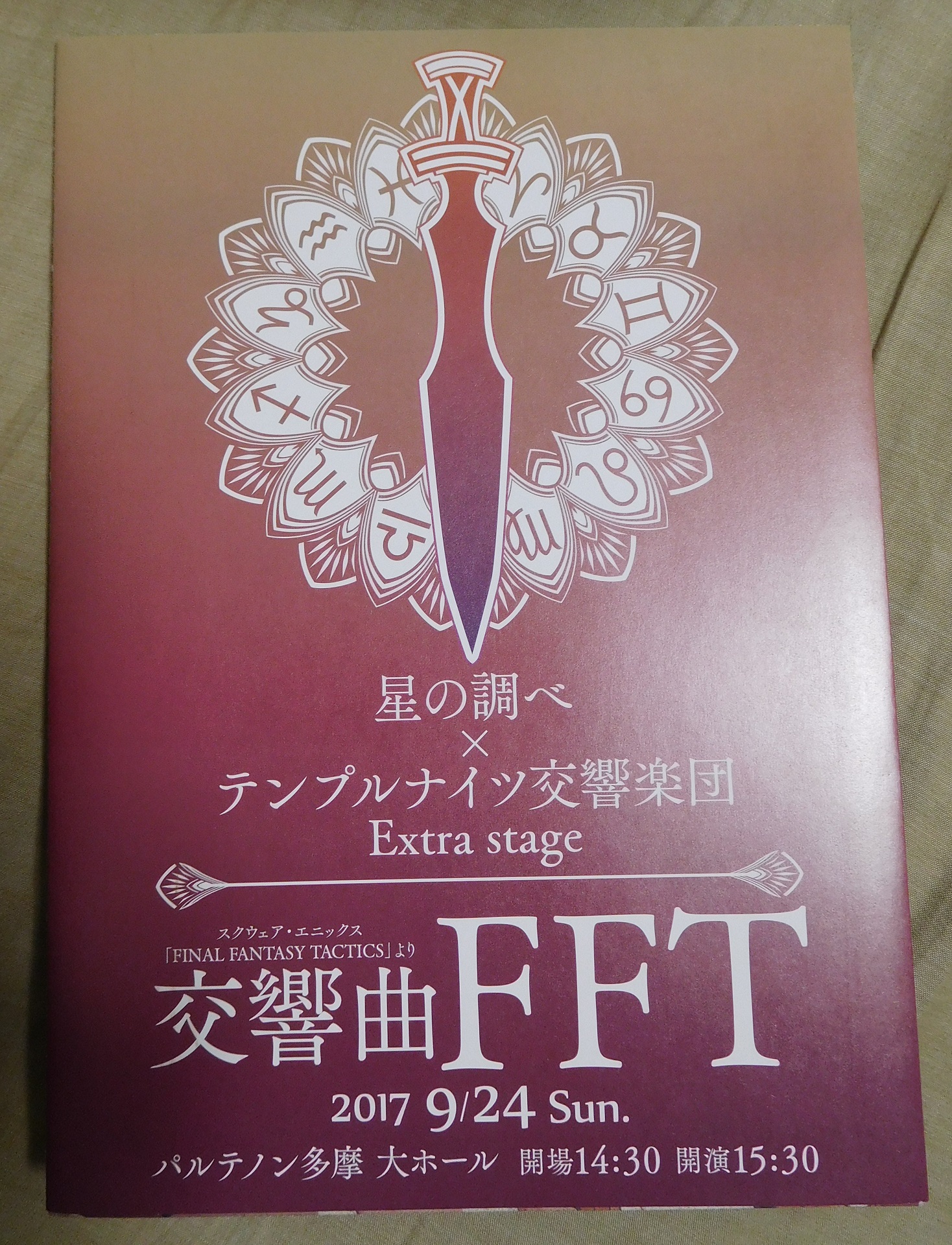 天秤の月2日 テンプルナイツ交響楽団の演奏会が行われた。 多摩センターって貿易都市ドーターなんじゃね。スラム街じゃないほう……開幕上り坂でゴリゴリHP削ってくる系ドーター……(主に私のMoveとSpeedが低すぎるせい)しかも割と暑かったのでオートポーション(スポドリ)をセットしておりSpeedセーブがつけられず……いやダメージ受けるごとになにくそってSpeed上げてくとかもう無理なのでそもそもSpeedセーブは習得してないんだけどアレだよとりあえず多摩センターは貿易都市ドーターなんだよ。そんなこんなで『星の調べ×テンプルナイツ交響楽団 Extra Stage』に行ってまいりました。パンフレットのクオリティがよーー! すげえんだよーー!! なーー!!! マジすげえだろーーー!! 超マジ!! これマジだから!!沈黙を治すのはボキャルだがやまびこ草でボキャ貧は治らないのですよ(そしてTにボキャルはない)クォータービューのドット絵、すばらしきかな…… なんでこんなにときめくんでしょうね。クォータービューってやつは。音楽に関しては知識のなさがSpeed20ぐらいでブッちぎっており、オーケストラとはなんぞやと問われても「あれだよね、なんかあの……管楽器とか弦楽器とかがワーッて大勢集まってジャンジャンジャーン! みたいなやつだよね」などと本当に語彙がエクスカリパーなので詳しく語れないが、とにかくすばらしかったということだけは間違いのないように述べておきたい。すばらしかった。ありがとうございます。 やっぱあの鐘の音色がなんともいえない(チューブラーベルというやつ?)いろんな曲でちょいちょい印象的に出てくるのであれが鳴るとフオオオオオオという気持ちになる。興奮する。『結果』がな……ほんと好きで……ジークデン砦を思い出して雪の中であああーっていう気分になる。「アルガスの次はお前の番だ」とか言っちゃう、ああーこの二人の友情っていったい、いや実はもともとどっちかが無理をして保っていたのか、士官候補生だしきっと日々の会話の中で政治の話なんかもしただろうしその中でラムザが無意識にディリータの地雷をブチ抜いていたことはたぶんあっただろうし、でもディリータとしては自分と妹の生活がベオルブ家にかかっているわけで、頭の切れる子供だっただろうから仕えてる先のお坊ちゃんに食ってかかったりはせずせいぜいやんわり諭す程度であとは受け流してたんだろうけどたぶんチクチク溜まっていくよなとか、それでも二人が同年代の仲のよい友人であったことは確かだったと思う(思いたい)し、まあまだ若いのでそのへんのことが決定的な亀裂にはならなかったのだろうし、冷静なディリータがティータのことになるとすごく取り乱したりするのもあの年代だからこそだし、そんな目に見えない程度だった二人の間の亀裂をアルガスがグリグリ広げてしまった感じはあるんだけど、彼は彼で御家再興の思惑というか望みがあったわけだし、そのとっかかりとしてちょうどよく目の前に転がってきた話だし、たぶん兄さんたちにとってもわりと都合のいい手駒だったと思うし、もちろん骸旅団討伐に参加した北天騎士団員がジークデン砦とゴラグロスもろとも吹っ飛ばされるよりは一人の犠牲で済んだらそれに越したことはないというのは合理的な考えであるしみたいなとりとめのない思考がアレして私はなんの話をしているんだそんなことを考えながらパンフレットカバー裏の絵を見ていると、彼らは誰一人いわゆるハッピーエンドには至らなかったけど全員でユニット組んで楽団やってたら素敵だなと思ってしまう。あとダンディな伯爵がたまらん。ダンディな伯爵が。たまらん。ダンディな!!! 伯爵が!!! もちろんあのエンディングに辿り着いたのも含めて彼らなので(しかもあれはすでに覆らない過去の歴史上の出来事だし)いいんだけど、なんかの掛け違いで生存IFじゃないけどもう少し幸せになる道はなかったんだろうかとか思わんでもないし、彼らが常に最善の道を歩んできたかというとそうではないんだよなあとか、作品ズレるけどFF8でアーヴァインが語っていた「いつだって選べる道は少なかった。時には道は1本しかなかった」という言葉を思い出したりして、そんなことを考え出すと切なさがMAXなんだけど、朗読劇でジュテームするMCオヴェリア様を想像するとなにもかもフッ飛ぶのでパブロは偉大。「一緒に地獄を見ましょう」っていうセリフ、いいですね……(自力でウイユヴェールクリアできなかった人)まあ覆らないといってもあくまで後世に書かれた歴史なので「違うんです!!! みんななんやかんやハピエンになったんです!!!」という説を唱える学者もいるのかもしれないし世界の懐は広い。(というか数年前にトゥイッタ上で「全員生きてますよ」という話が出たよね……なんかこのへんのトゥゲッタ……ここでも過去にその話に触れた気がするなこれだな)まあともかく古のオタクにマントは欠かせないのであります。あのなめらかに